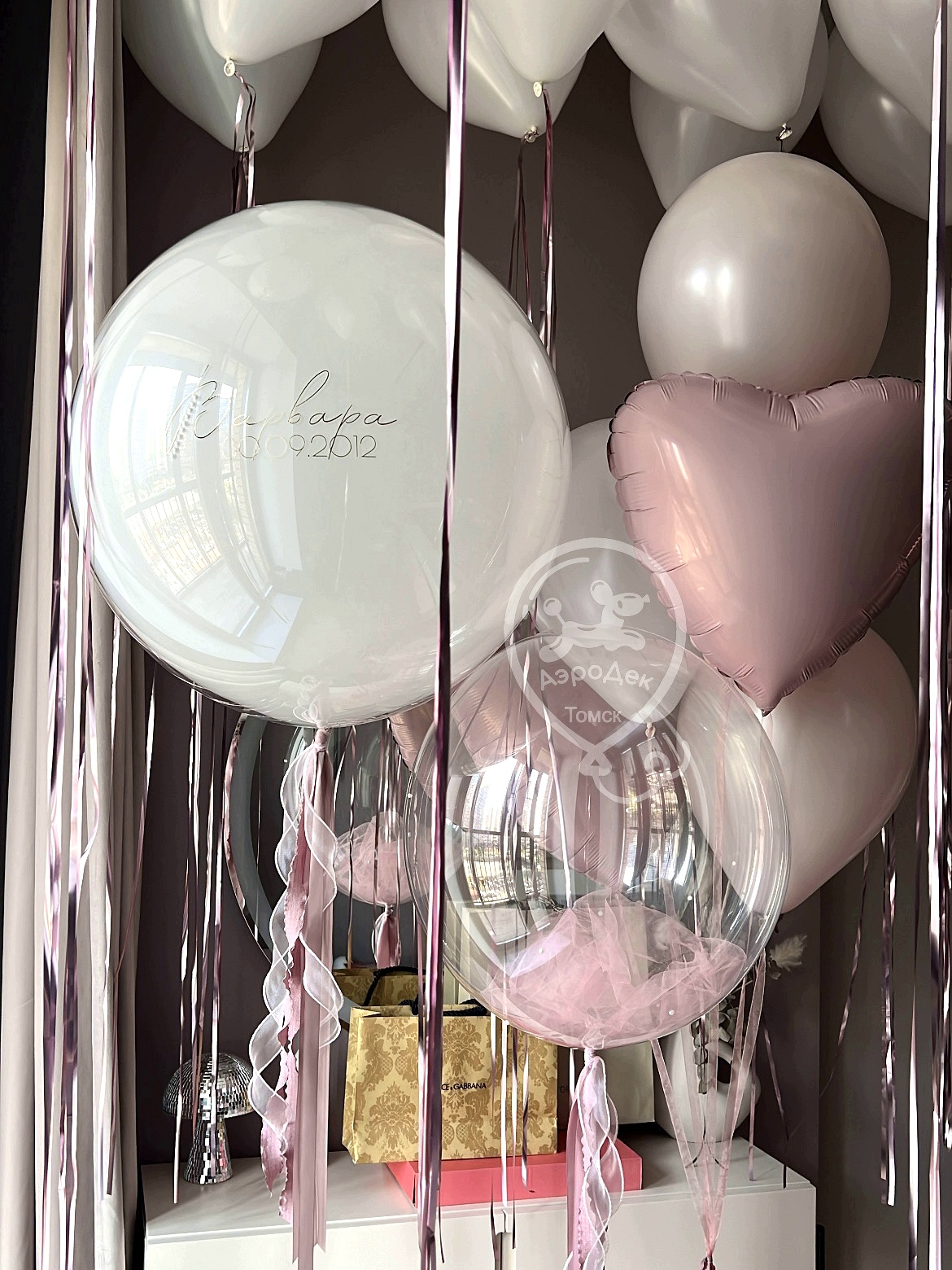 - 1 букет из шаров - 2 сердца 45см розовых, 2 розовых пудра, 1 белый, 1 грузик.