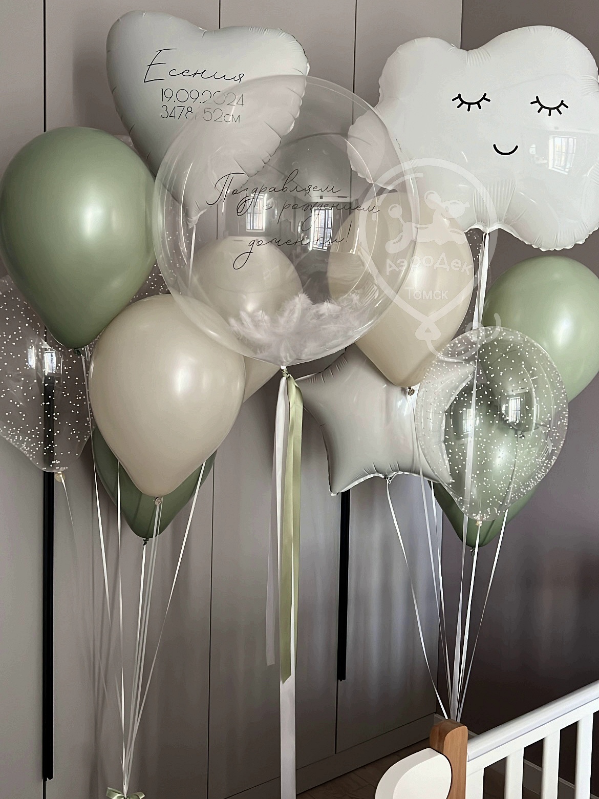 - 1 букет - 1 облако, 1 шар с шариками внутри, 1 звезда 45см, 2 оливка, 1 грузик.