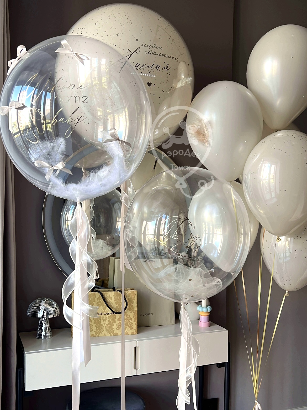 - 1 шар бабблс с перьями, бантиками и надписью, 1 грузик.